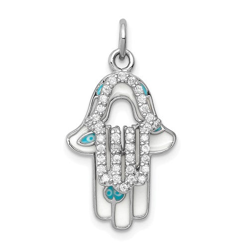 Sterling Silver Rhodium-plated Enamel Hamsa with CZ pendant