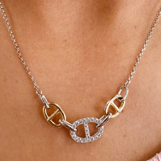 ELLE Sterling Silver Twisted Oval Link Necklace with Cubic Zirconia