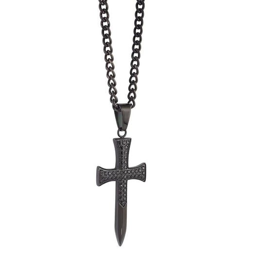 Stainless Steel Gold Ion Black Cubic zirconia Sword Cross Necklace