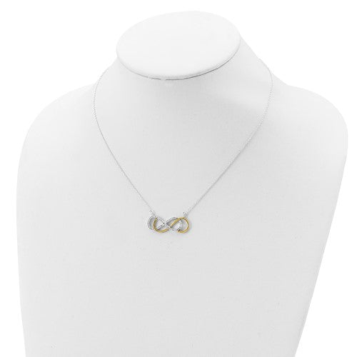Embrace the essence of eternal love and connection with the Dual Infinity Necklace. Crafted in Sterling Silver and Gold Plated. The exquisite peace features two intertwined infinity symbol, elegantly representing the unbreakable bond. The necklace is delicately designed to catch shine from cubic zirconia, creating a radiant shine that enhances any outfit, from casual to formal. Both Infinity is attached to a 18 inch rollo chain.
