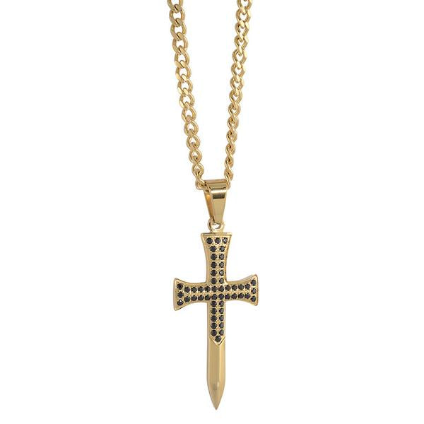 Stainless Steel Gold Ion Black Cubic zirconia Sword Cross Necklace