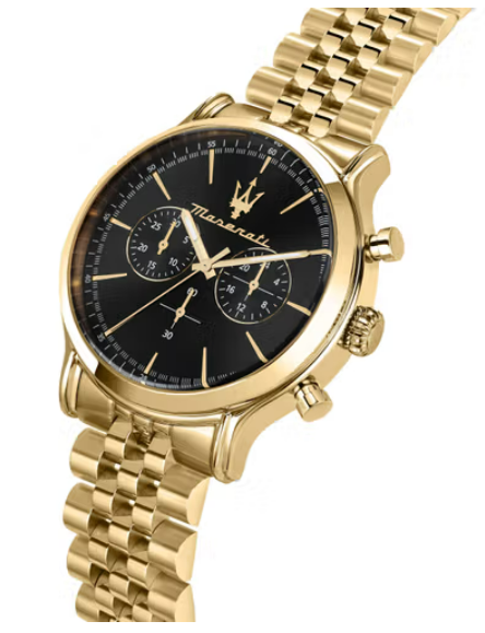 Discover timeless luxury with the MASERATI EPOCA MEN'S WATCH. Featuring a sleek black dial and a gold belt, this watch exudes sophistication and style. Elevate your look and make a statement with Italian craftsmanship.