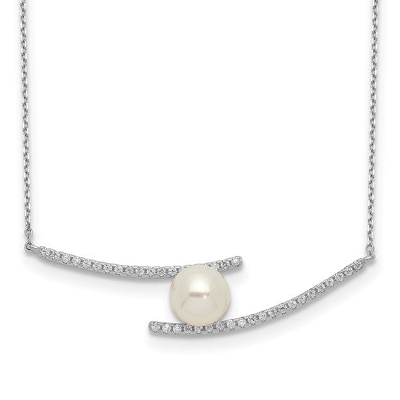 This stunning necklace combines classic sophistication with modern elegance. Crafted from high-quality sterling silver and plated with rhodium, it offers a radiant, tarnish-resistant finish that enhances the natural beauty of the piece. The necklace features 7-8mm pearl, known for their smooth surface and delicate sheen, adding a touch of timeless charm. Accentuating the pearl, sparkling cubic zirconia stones are strategically placed to create an extra layer of brilliance and light, providing a dazzling contrast to the softness of the pearl. Perfect for a wide range of occasions from weddings and anniversaries to formal dinner.